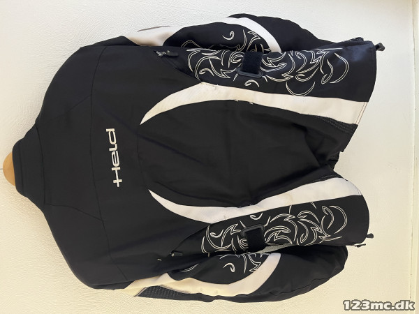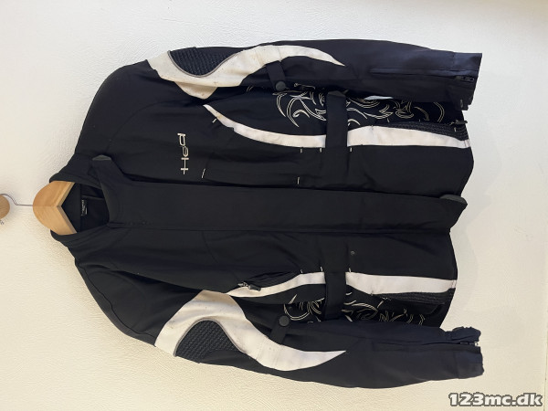 Held dame motorcykeljakke i sort og hvid med dekorative mønstre på ærmerne. Jakken er designet til motorcyklister og har justerbare stropper ved taljen for bedre pasform. Materialet er slidstærkt og velegnet til beskyttelse under kørsel.