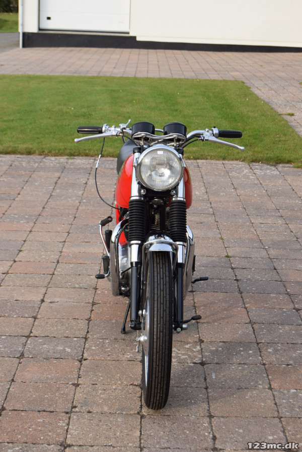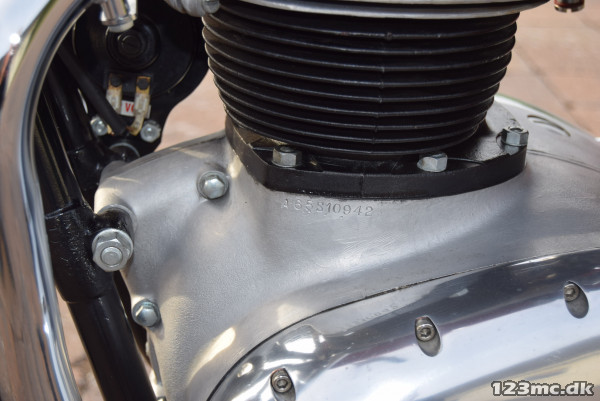 Aluminium benzin tank og Amal Concentric Premier karburatorer. Monteret med almindeligt styr for en mere opret kørestilling i forhold til det TT styr der normalt er monteret sammen med den store benzin tank.