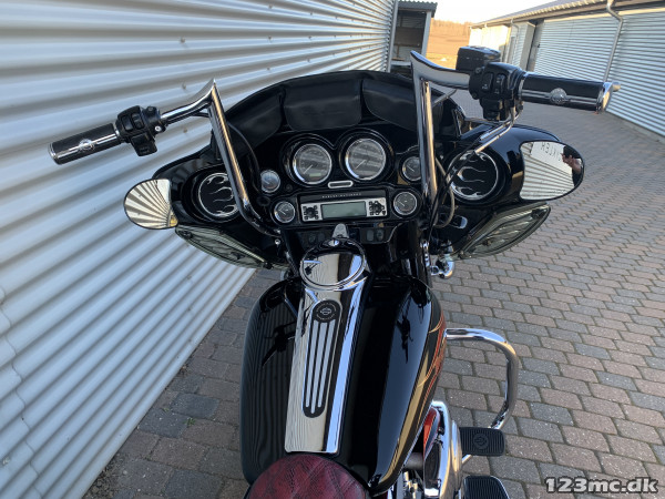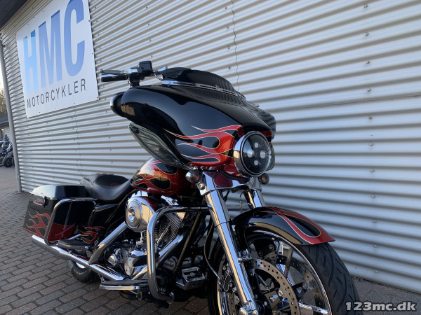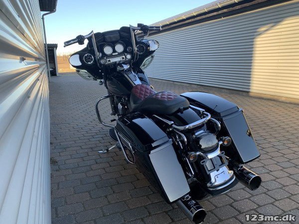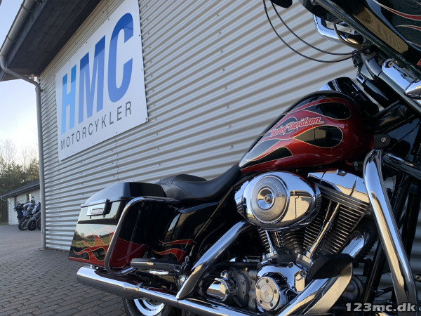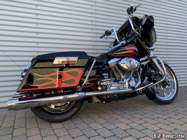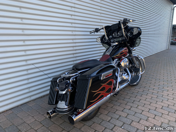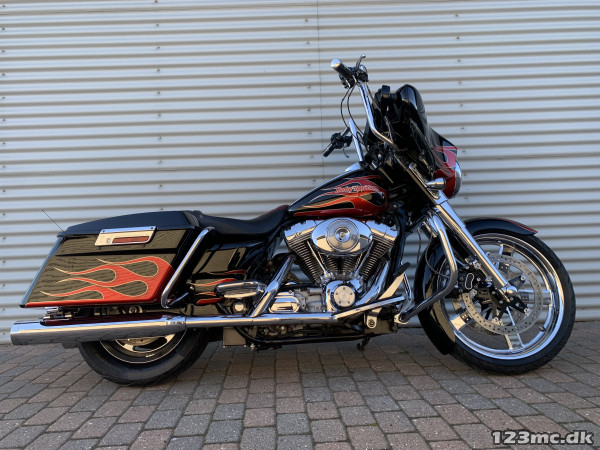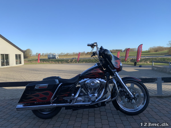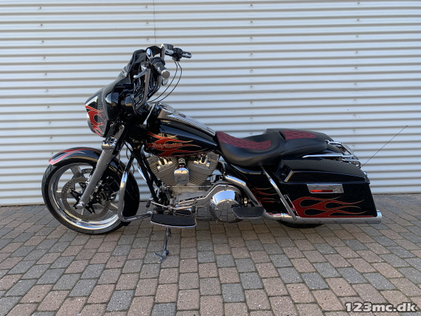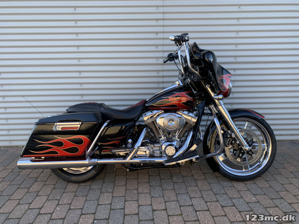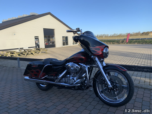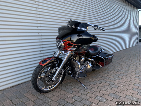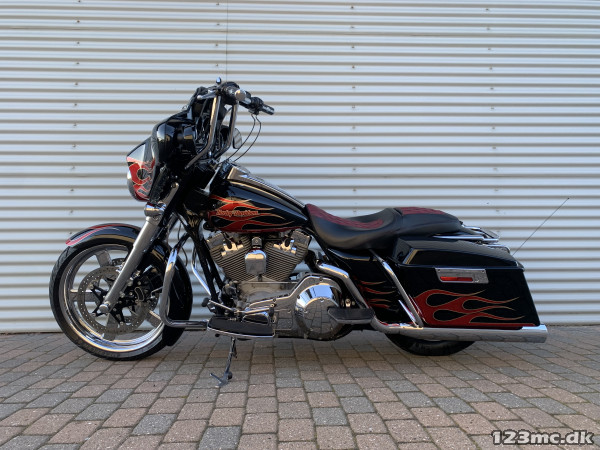 Electra Glide Classic lavet som custom "Street Glide" med 1450 / 88" twincam motor. Motor konverteret til 103" cui, nye knaster, knastkæde, oliepumpe, lejer, krumtap. Motor upgrade / Renovering udført af caps Aarhus. Efter renovering har den kørt ca 25000km. SE Bagsvinger stabilisator monteret. Mega flot lakering som også er lavet for ca 25.000km samtidig med motor, total den gang blev der smidt tæt på 200.000kr i cyklen!!! Høj krom fatbar styr, special sæde syet i samme farve tema, custom forfælg og bagfælg, up-grade bremser fra Arlen Ness. Kun 2.Ejere, samme ejer de sidste 9.år. Cruise control (elektronisk fartpilot). Bygget fra FLHT til FLHX Street Glide.