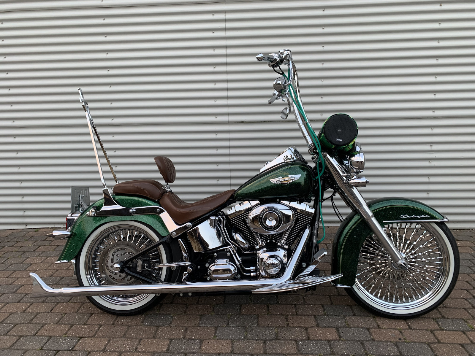 Softtail Deluxe modellen, den forfinede Heritage Classic :-). ABS, 103" 5HD Europa-model. Vanes & Hines Fishtail Udstødning. Original farve i Hard Candy Costum lakering "Lucky Green Flake". Fed Deluxe i chicano style. Special fælge med tvunden eger hvor forfælg er valgt i 21". Masser af detaljer på cyklen, højere styr med alt i krom, Mustang sæder med rygstøtte til fører. Soundbox ala chicano style. Bremseslanger kan let blive mørkgrå igen, sker nok snart :-) og kan også leveres med original sorte sæder + der medfølger en del originale dele. Tidligere ejer har investeret 80.000kr + + i cyklen. Står i rigtig flot stand nærmest som ny og med en hav af extra krom. Bør ses live og prøves.