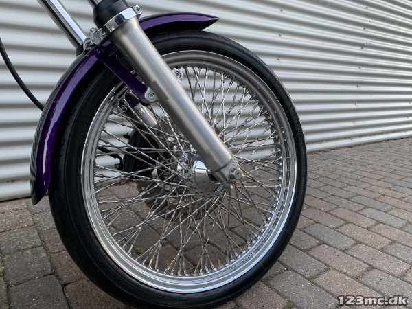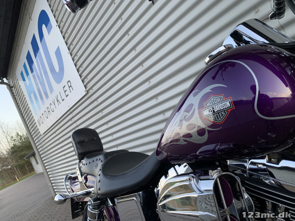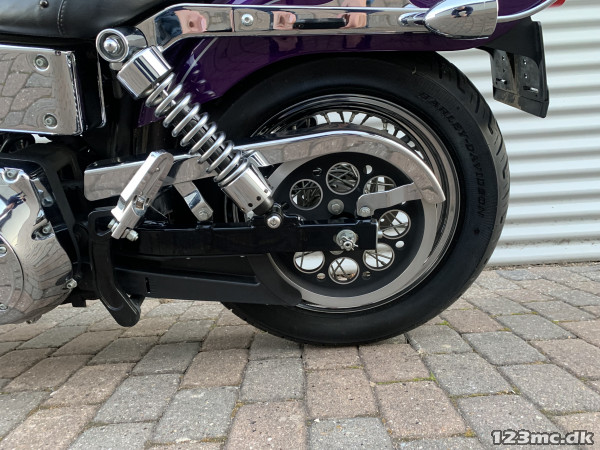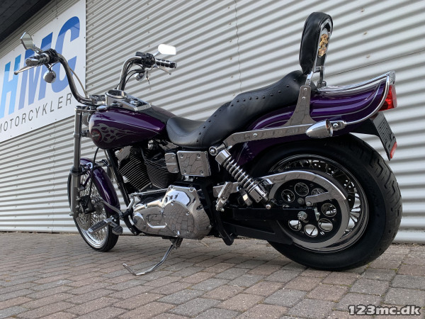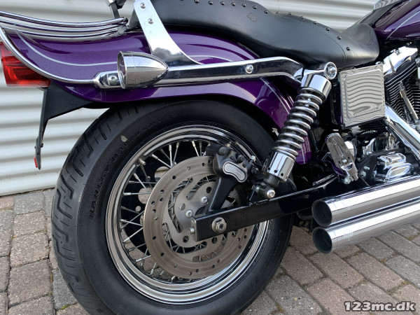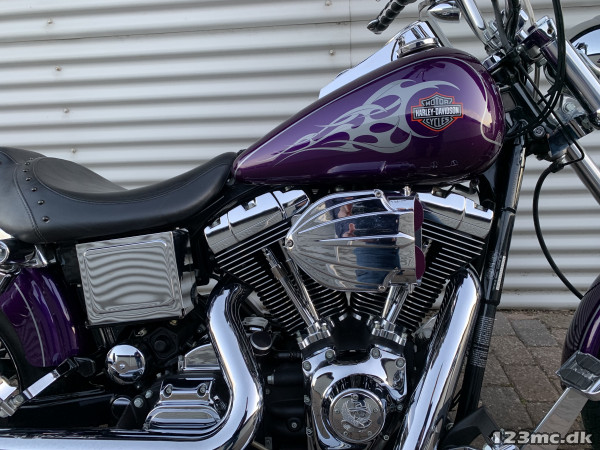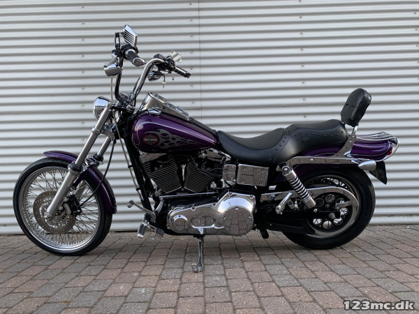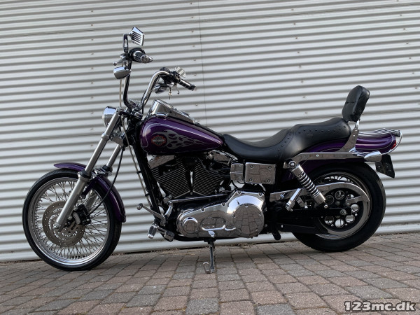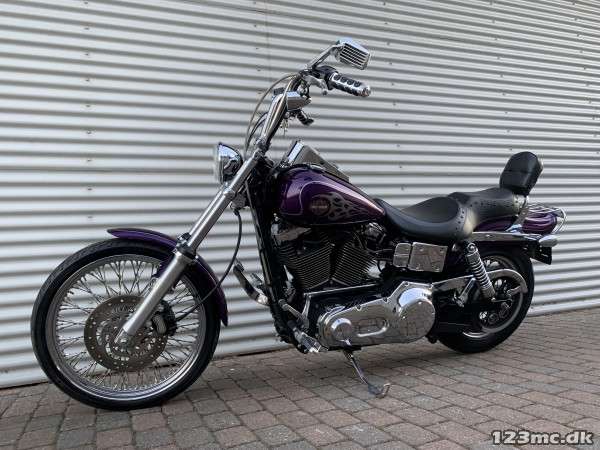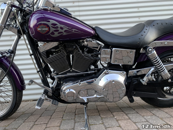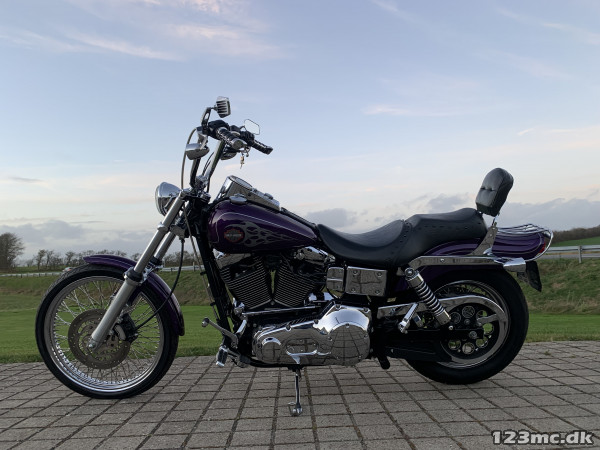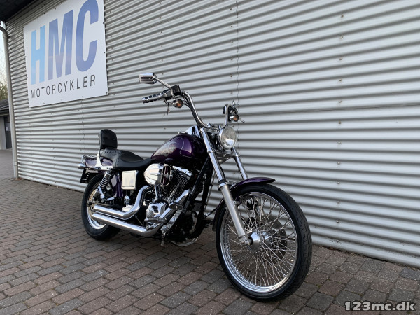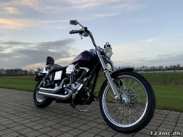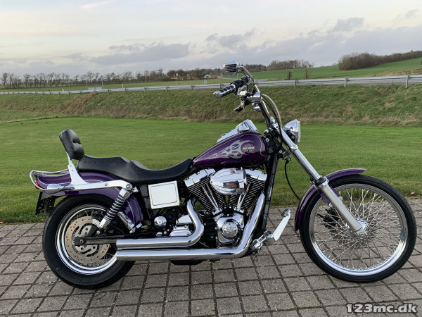 Flot dyna Wide Glide som står i rigtig rigtig flot original stand, virkelig tidstypisk original lakering fra Harley Davidson i farven Concord purple pearl. FXDWG med den helt rigtige lyd fra Komplet Vanes & Hines, special luftfilter. Står fantastisk flot i alt lak, krom og alu, bør ses. Gaffelbro stabilisator på forgaffel, sizzybar, bagagebærer, mørke blink. Monteret med en del extra krom, fremflyttersæt, fodhviler for+bag, håndtag, spejle osv. BEMÆRK KUN 34.000KM.