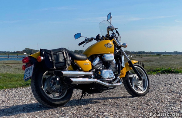 Fremstår original med efter monteret lille vindskærm. Magnetoplader til mobil er monteret. Nyt fordæk, ny benzinhane (pumpe) Har lidt chrom skade på udstødning, ikke udheld.