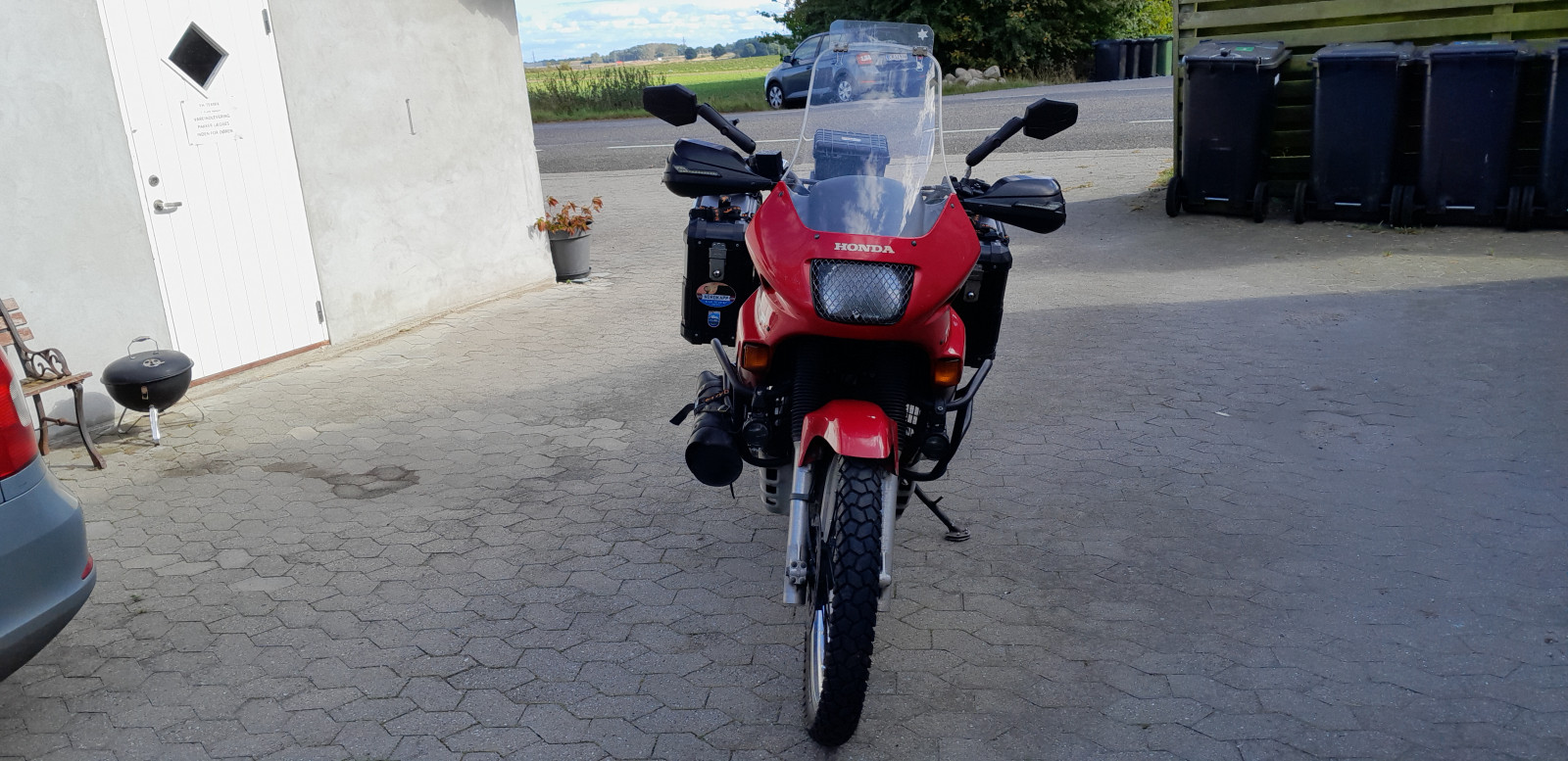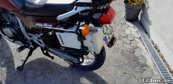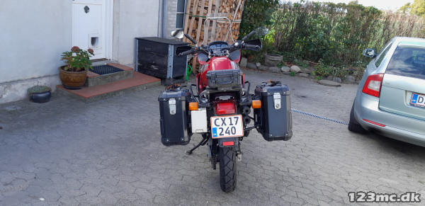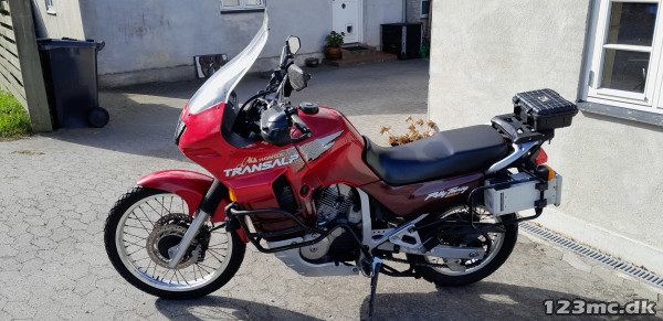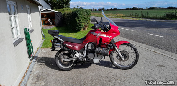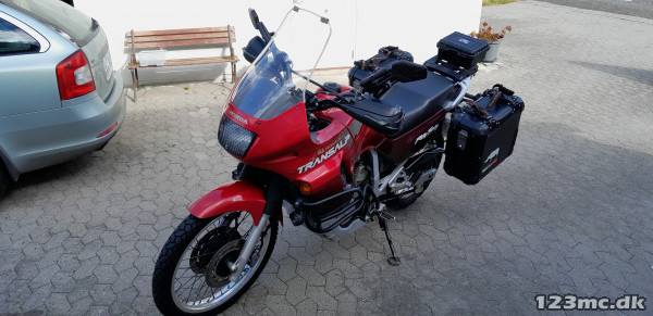 Fin Trans Alp med tasker og temperatur styret køleskab (medicin) eller drikkelse :-), serviceret og vedligeholdt, lys i handguards + ekstralys på styrtbøjle, gode dæk, kæde og tandhjul, forskellige gearinger og sort glasfiber vindskærm medfølger