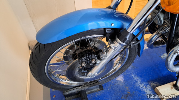 Den har bremsekaliber på både h/v side. Man skal regne med den skal ha en justering i karburatoren efter den har stået stille de sidste 10 år.