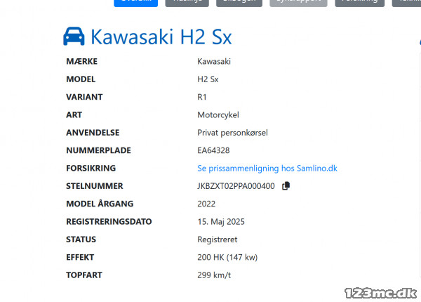 Bemærk, at det er muligt at sammenligne modeloplysninger for Kawasaki H2 SX med din egen MC, hvis du opretter den i din brugerprofil under "Primær MC".