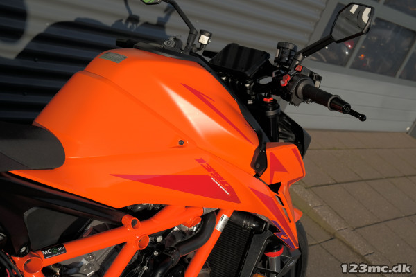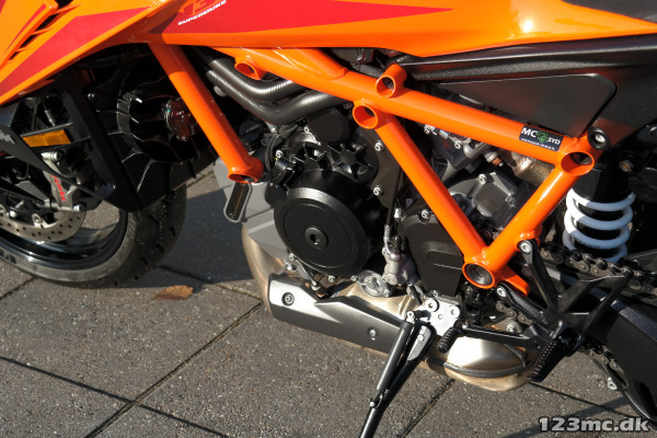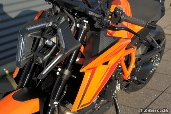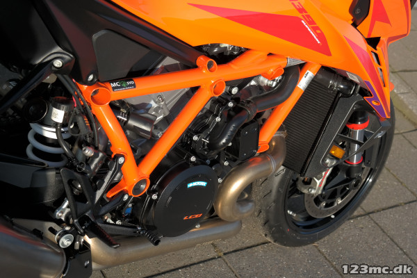 2024 Super Duke R er udstyret med en 1301cc V-twin LC8-motor, der leverer en imponerende 180 hk og 140 Nm i drejningsmoment. Den lette motor, kombineret med en optimeret vægtfordeling, gør motorcyklen ekstremt responsiv og eksplosiv, både på banen og landevejen. Motoren er tilpasset med en ny udstødning, der forbedrer både ydeevne og lyd.