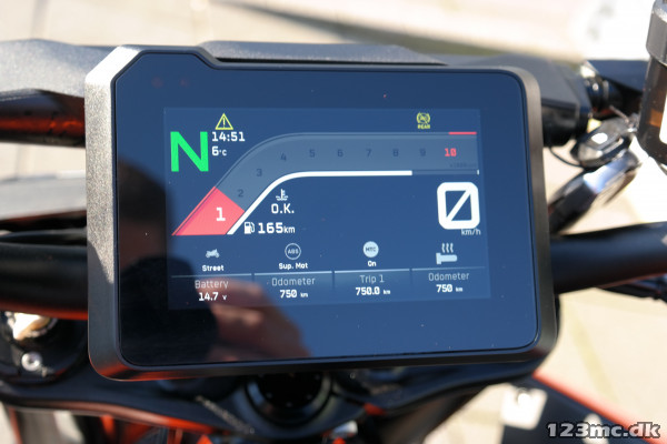 KTM 1290 Super Duke R 2024 er fyldt med avanceret elektronik. En 5" TFT-skærm giver nem adgang til motorcyklens mange funktioner, som inkluderer flere køreprogrammer (Street, Sport, Rain og Track), cornering ABS, traction control, anti-wheelie og launch control. Med "Track Mode" kan du tilpasse indstillingerne til personlig præference og få maksimal performance i krævende situationer.