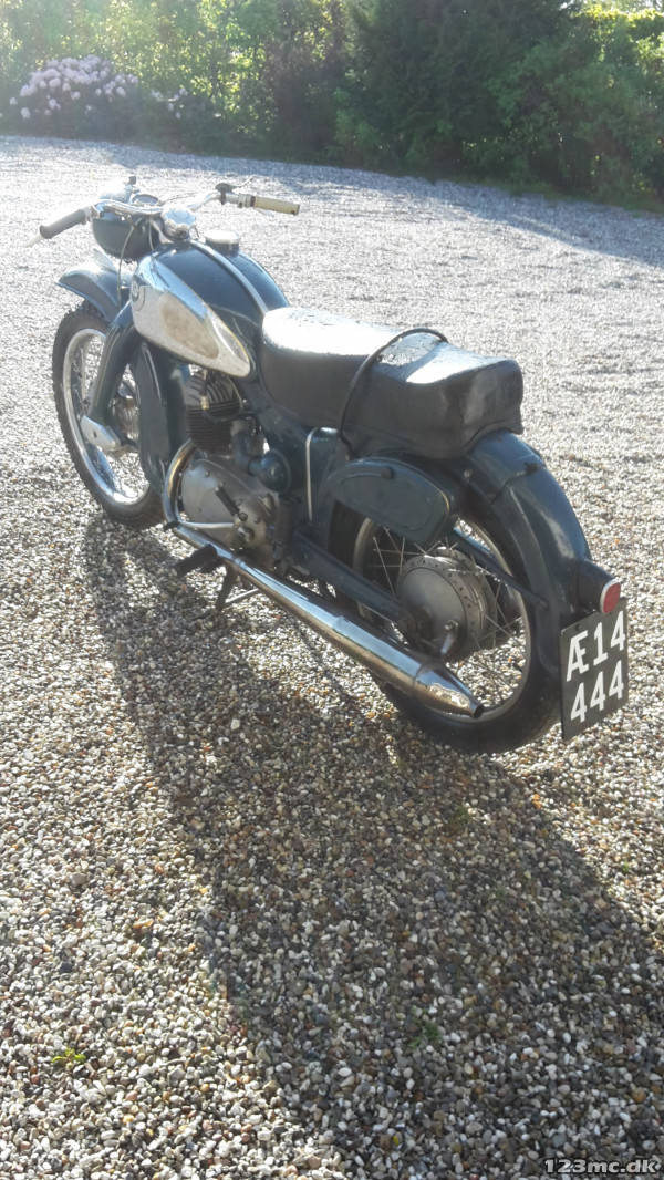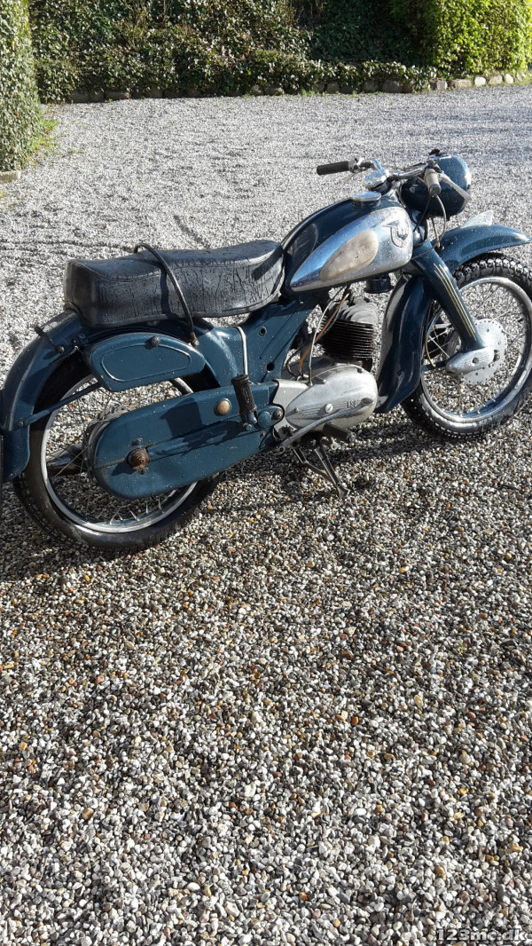 Flot blå veteranmotorcykel fra 1955 indreg på sorte plader ,med nyere batteri og dæk- Starter fint. Der hvor der er anført 123 er grunde at oplysningen er ukendt. Speedometer viser 31551