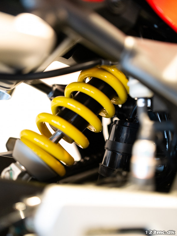 Med fuldt justerbare Marzocchi USD forgaffel og Marzocchi mono-støddæmper bagpå får du suveræn kontrol og komfort – uanset underlag. Bremsesystemet fra Brembo med dobbelte 320 mm flydende skiver og radialt monterede kalibre foran samt 260 mm skive bagpå med ABS giver maksimal bremseeffekt og sikkerhed.