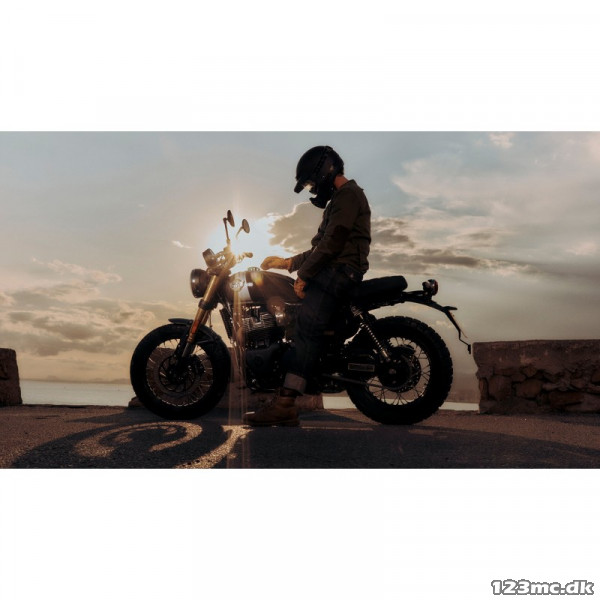 Farven ændrer karakter med lyset – fra varmt gylden i dagslys til et mere bronzelignende skær i aftensolen – hvilket understreger motorcyklens håndværksmæssige kvalitet.