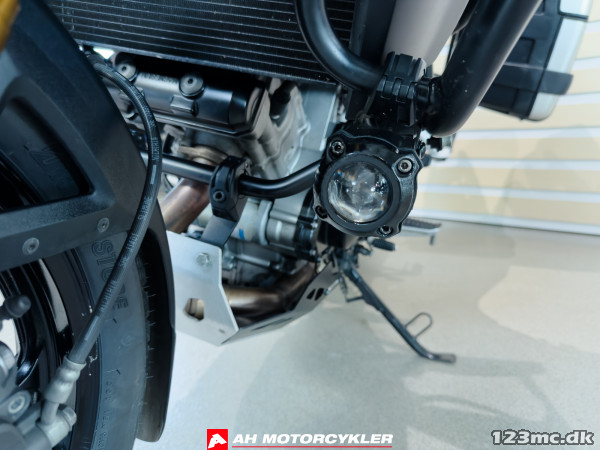 Under den karakteristiske næb-forklædning banker en 1.037 cc 90°-graders V-twin, der leverer 99 hk og 103 Nm drejningsmoment allerede ved 4.000 rpm – det giver en usædvanlig elastisk og brugbar kraft, uanset om du er på motorvej eller snoede biveje.