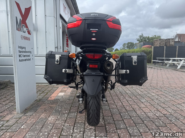 ABS bremser, kørecomputer, centralstøtteben, høj vindskræm, slip-on udstødning, startspærre, indsprøjtning, halvkåbe, lev. nysynet, topboks, sidetasker