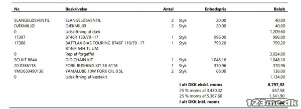 Der foreligger værkstedsoverslag på dæk, kædekit og forgaffelservice (ca. 11.000 kr inkl. moms).