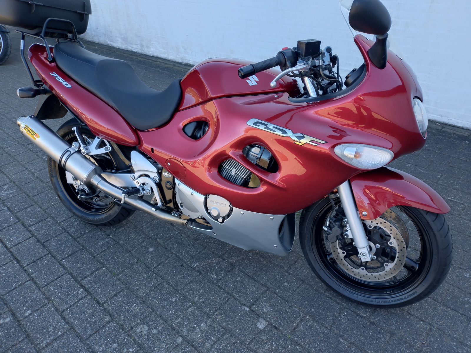 Fantastisk flot og velhold SUZUKI GSX 750 F lev. med bl.a - Centralstøtteben, slip-on udstødning, fuldkåbe, tonet/farvet kåbeglas, topboks, 1 ejer, lev. nysynet, A2 kørekort muligt . lev nysynet med 2 års garanti ..... SKAL SES ..
