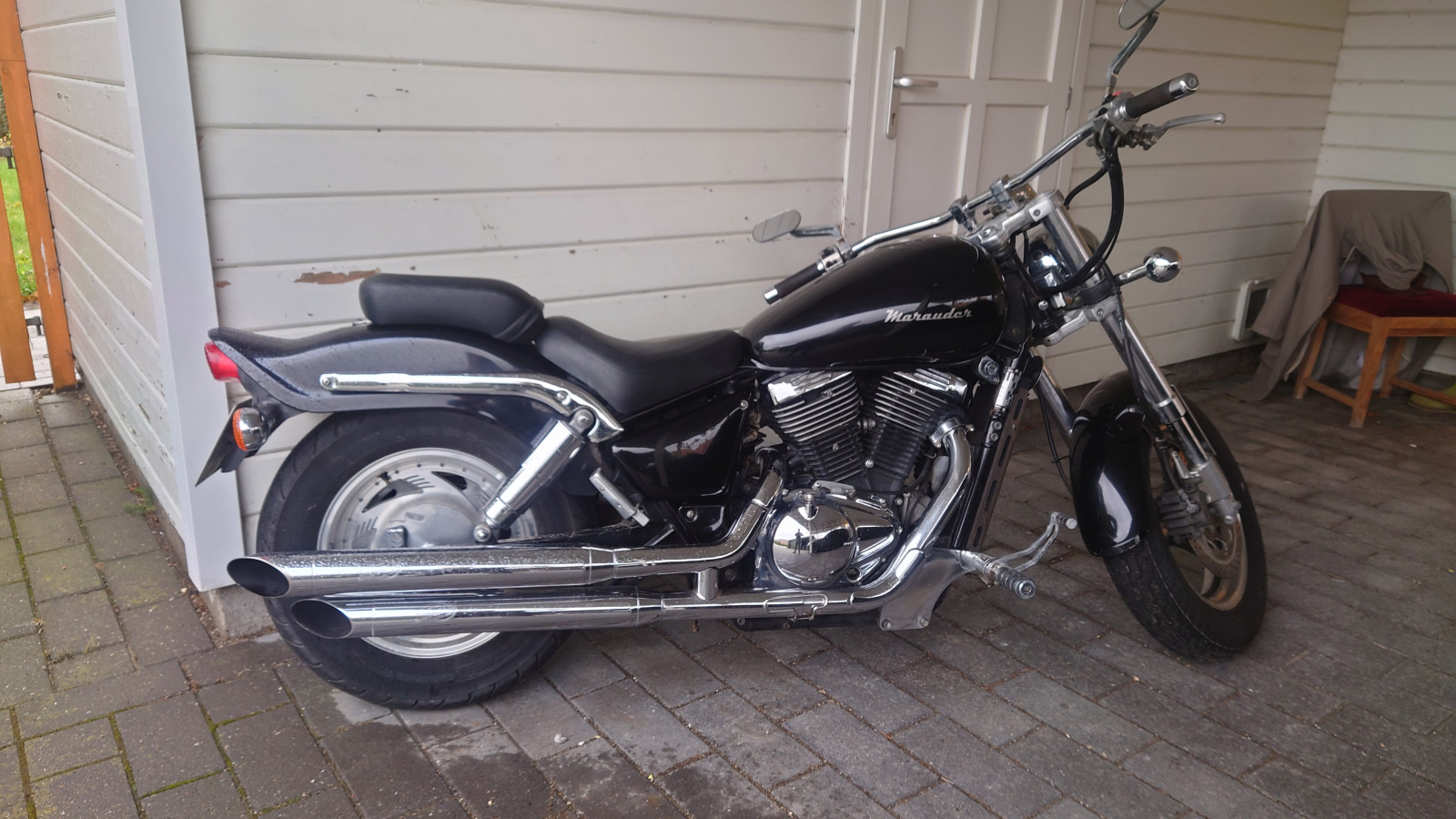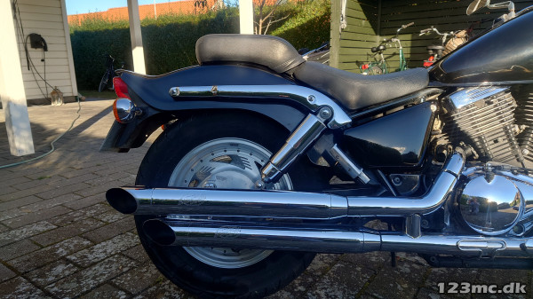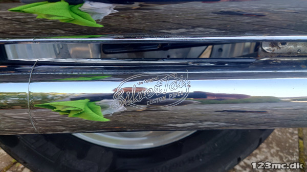 Der er pt. sat Silvertail - custom pipes på + et andet styr end det originale. De originale udstødningsrør + styr følger, ligesom der også følger sidetasker med .