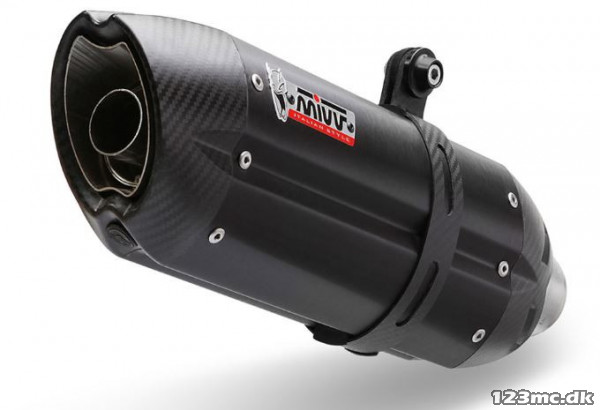 Den sorte, ovale lyddæmper er fremstillet i rustfrit stål med en eksklusiv "Black Moon" børstet finish, der giver et aggressivt og moderne look. Den affasede endekappe i carbon understreger den sporty karakter, mens den lave vægt bidrager til en forbedret køreoplevelse.
