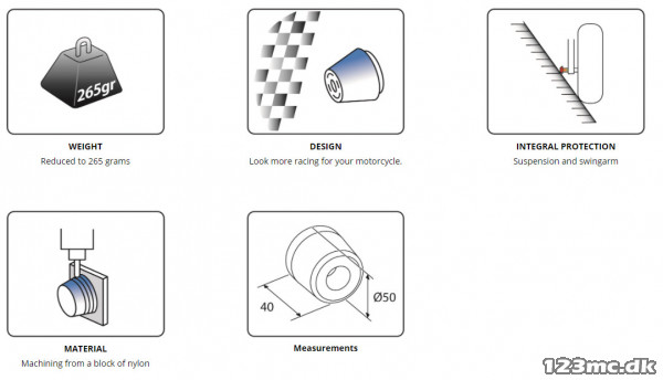 Akselbeskytteren fra Puig beskytter både aksler, forgaffel og svingarm. Beskytterne er fræst i det utroligt slidstærke nylon.