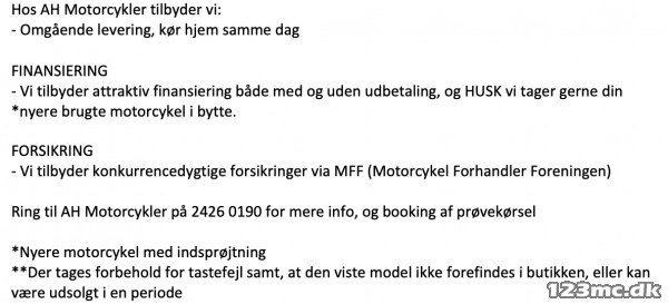 Ring til AH Motorcykler på 2426 0190 for mere info, og booking af prøvekørsel