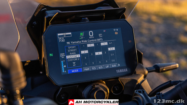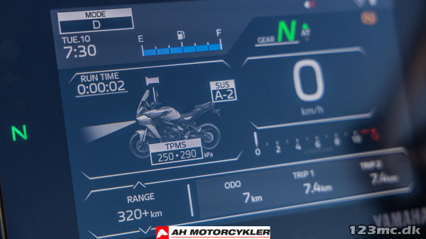 7" TFT har tre temaer og leveres med Garmin Motorize-tilslutningsmuligheder for at give integreret navigation, mens samtaler, beskeder og musik kan modtages via Yamaha MyRide-appen og styres ved hjælp af 5-vejs joysticket på venstre kontaktenhed. Et dedikeret integreret opbevaringsrum inkluderer et USB-A-strømudtag til opladning på farten.