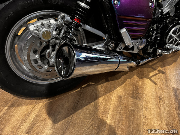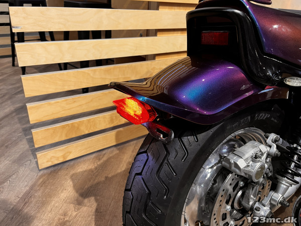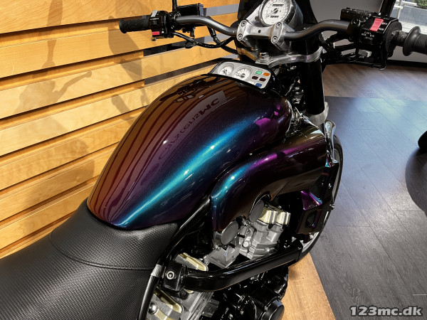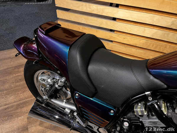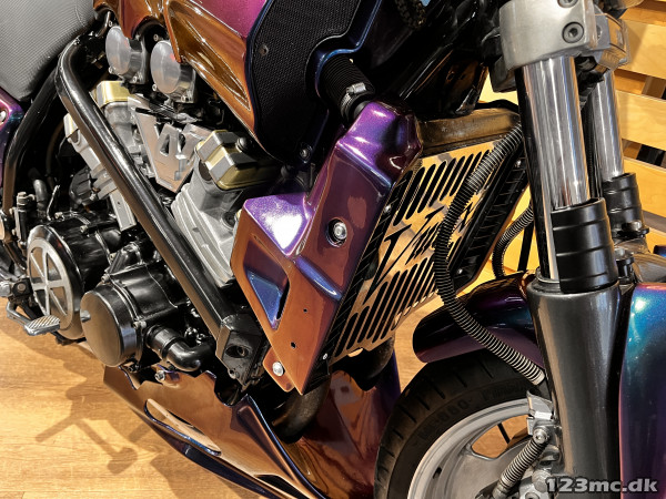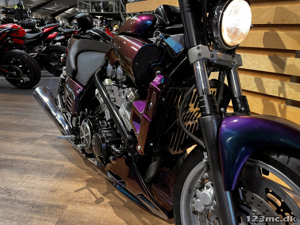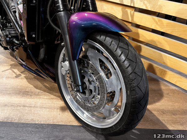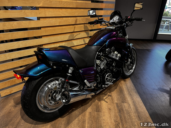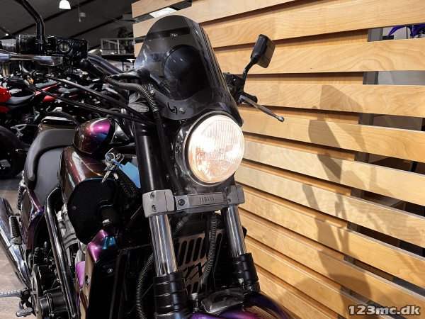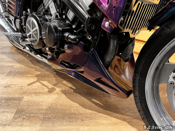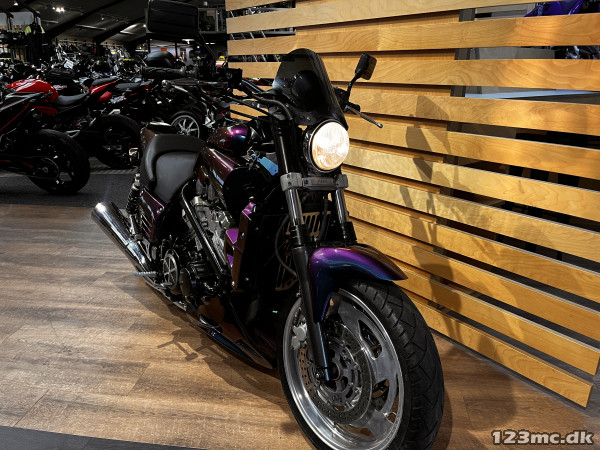 Yamaha V-Max er en legende blandt power cruisere, kendt for sin brutale kraft og karakteristiske design. Denne model har kørt 42.200 km og står i en flot camæleon-lakering, der skifter farvetone alt efter lys og vinkel – en virkelig iøjnefaldende maskine.