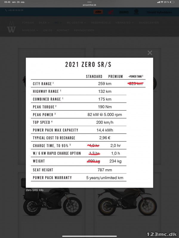 Bemærk, at det er muligt at sammenligne modeloplysninger for Zero SR/S ZF 15.6 med din egen MC, hvis du opretter den i din brugerprofil under "Primær MC".