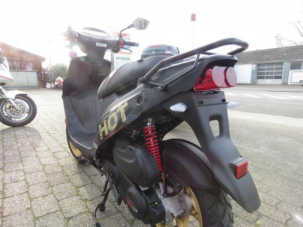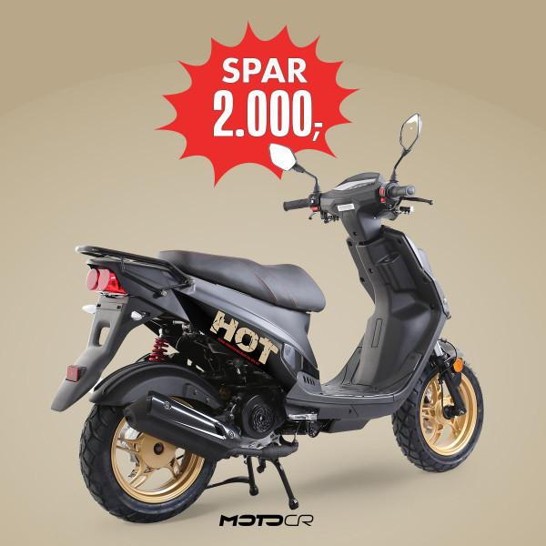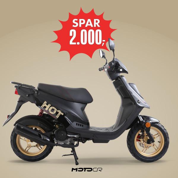 Den populære Hot 50 SP - i ny version med EFI- motor (indsprøjtning) og flot facelift med guldfarvet fælge og guldstafferinger. EKSTRA COOL, MEN STADIG HOT Som enhver HOT50, er HOT50 SP’eren konstrueret til at klare det meste. Du får dog ekstra glæde af SP’eren, hvis du samtidig tænder på tofarvet lakering, sidestøtteben og USB-strømudtag under sadlen. Du får endvidere en bedre udstyret HOT50, der altid får dig sikkert ud og hjem.