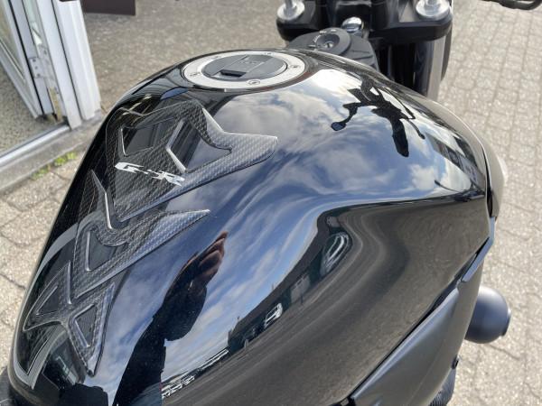Motorcyklen er udstyret med Rizomablinklys i bag, kort nummerpladeholder og tankpad.