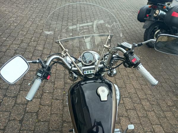Motorcyklen er udstyret med: Vindskærm, læder sidetasker, sissybar og ekstra lygter.