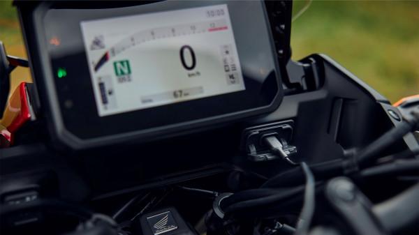 5" TFT skærm med Honda RoadSync – Cruise Control via Throttle By Wire – 5 køremodes – Showa Elektronisk styret affjedring (EERA), justerbar forspænding med 130 (for) og 144 (bag) mm vandring – Smart Key – Emergency Stop Signal – Femtrins justerbar vindskærm – 6-akset IMU – Varme i håndtag – Quickshifter – Cornering ABS – 37/28 liters sidetasker – Håndbeskyttere – USB-C oplader