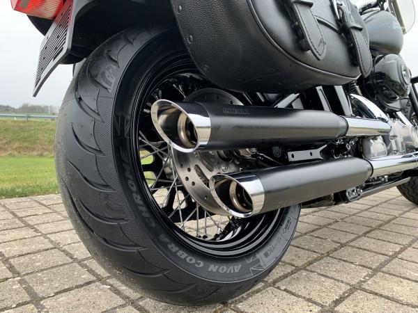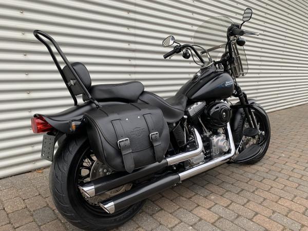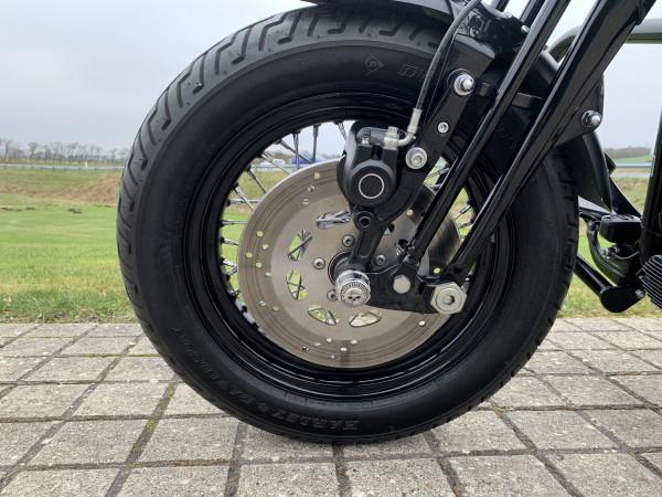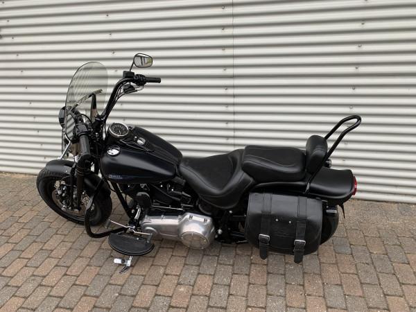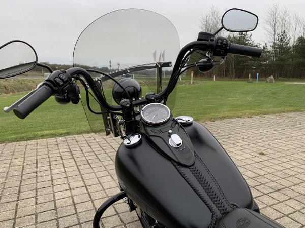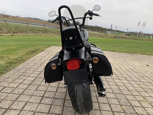 96"/1584ccm, 6.speed gearkasse. Matsort lakering. Sizzybar click-on, sidetasker i læder, motorbøjle, sort mini ape-hanger styr, nye Cobra slip-on udstøning. Vindskærm, Komfort 2-delt sæde fra Mustang. Speedometer med omdrejningstæller & gearindikator. Bemærk modellen er født med 200 bagdæk :-). Cyklen står rigtig flot, original stand , meget velholdt & næsten som ny.