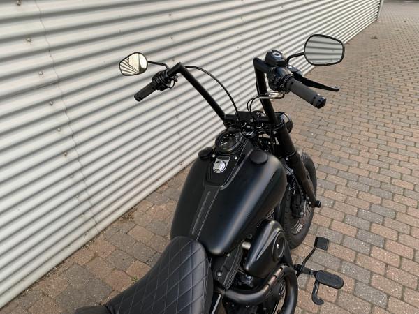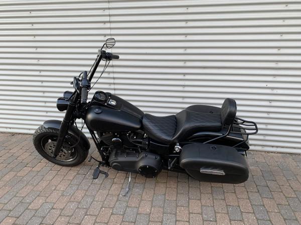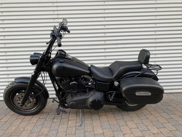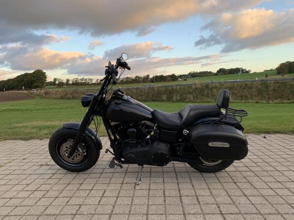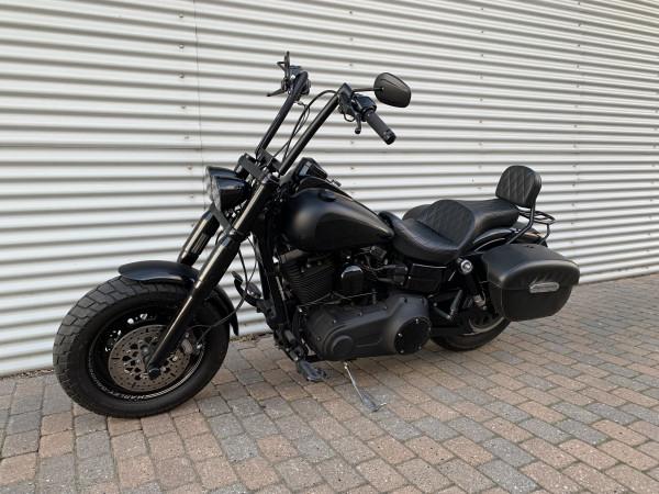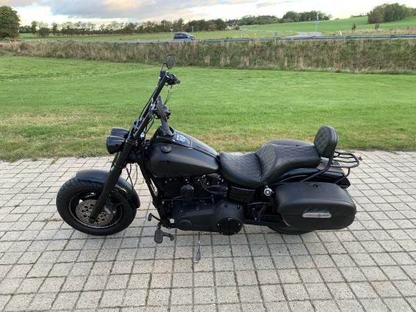 Fat Bob i farven Matsort med sorte stafferinger og felt på tanken. ABS, 103" motor. Monteret med E-godkendte Elektronisk Jekill & Hydes udstødning, højt styr, originale sidetasker.