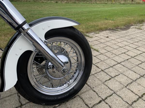 Slip-on udstødning, sidetasker, Sizzybar, Mustang komfort sæder med rygstøtte, høj styr "mini Apehanger", Led forlygte + led extra lygter, motorbøjle med higway-pegs. Købt ved FCH Custom i Maj 2020 hvor den blev opgraderet med nye dele og service for 32.000kr. Vinter 2020 renoverer Bike-Doktoren motoren samt ruller den ind på felt (motor kørt 6000km efter efter renovering). Den har fået nye S&S motorblokke, krumtap lavet, nye lejer osv. Samtidig får den komplet ny forgaffel. Der er smidt ca 80.000kr i cyklen inden for de sidste få tusinde kilometer.