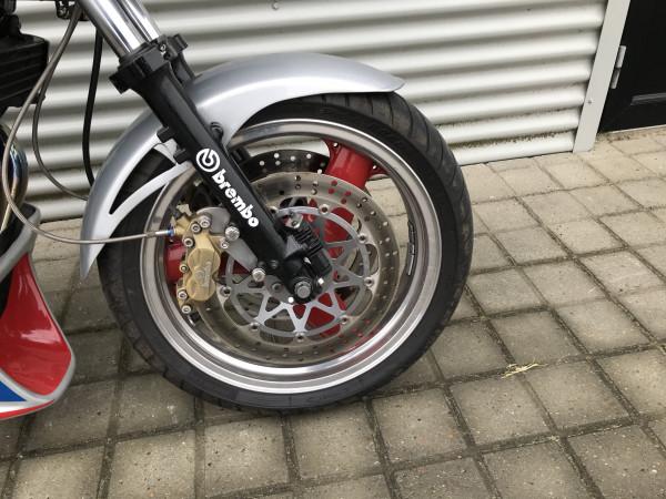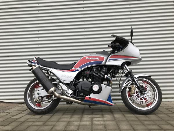 GPZ1100i med fuld 4i1 med carbon Akrapovic potte, dejlig klassiker med lidt fed ombygning. Første japser med indsprøjtning.