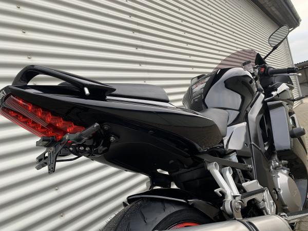 Mørk kåbeglas, kort nummepladeholder, crashpads, mini led-blink "running led", indfarvet Hugger / Bagskærm, Leo Vince bolt-on udstødning med E-godkendelse.